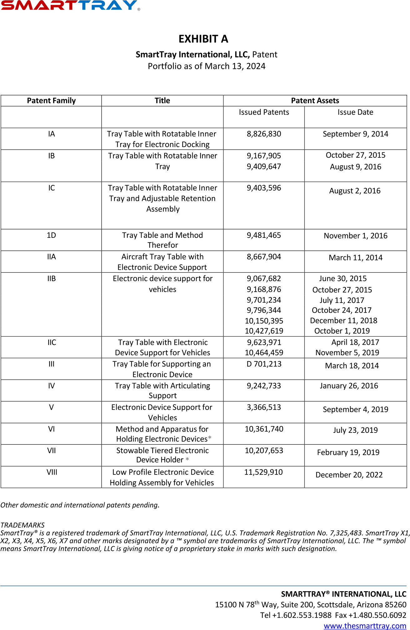 SmartTray® International, LLC pioneered patented Personal Electronic Device (PED) holders for use in commercial aviation in 2011. United Airlines was first to license SmartTray patented technology in 2014. Today, SmartTray has eighteen granted patents in the US and Europe covering broad range of integrated PED holder solutions in passenger seats and tray tables for use in aviation, rail, bus, automotive and marine transportation. SmartTray PED holders facilitate hands free use of smartphones and tablets significantly enhancing on board entertainment experience. SmartTray proprietary PED holders are within arm’s reach and in full sight of each passenger. There is no pain or muscle fatigue from holding PED’s boasting superior ergonomics and better customer loyalty. Replacing traditional food tray tables with SmartTray multi-function tray tables that hold PED’s at each seat offer lowest cost options to upgrading passenger seats in BYOD environment. For most installations, SmartTray can be installed in entire aircraft, bus, or a train car in just a few hours resulting in significant cost savings and without taking vehicles out of service. SmartTray is privately owned. For information about licensing and strategic partnership opportunities please inquire at: info@thesmarttray.com..